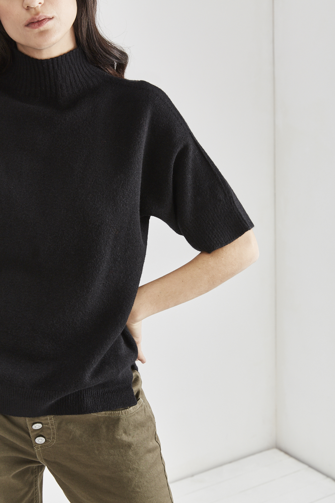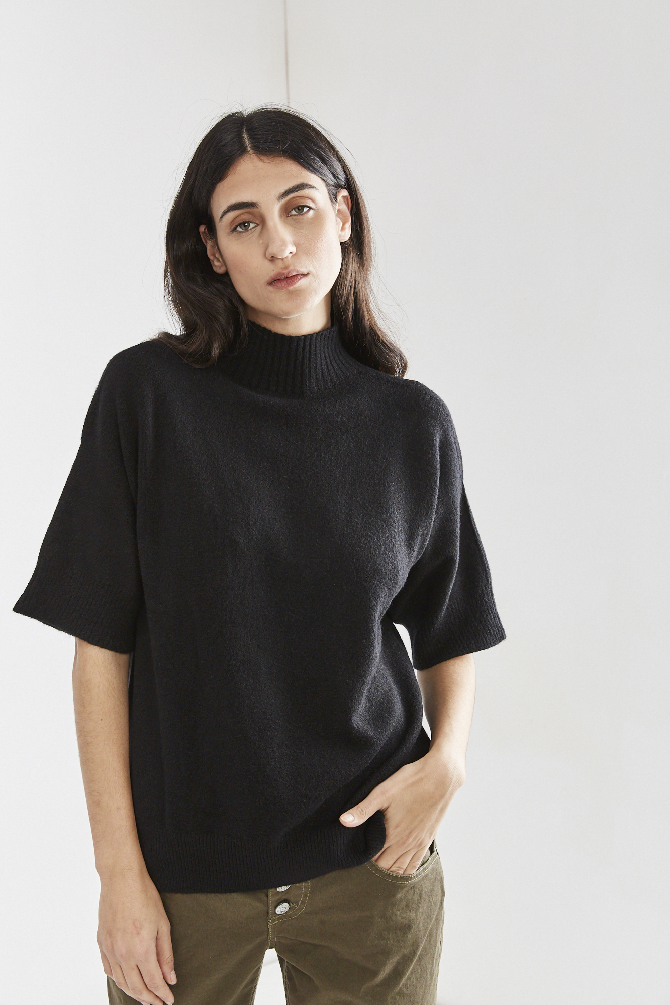 חולצת סריג נעימה שיכולה גם להפוך לאפודה. שרוול עד המרפק, שני שסעים בצדי הגוף וצווארון ניקי גבוה
