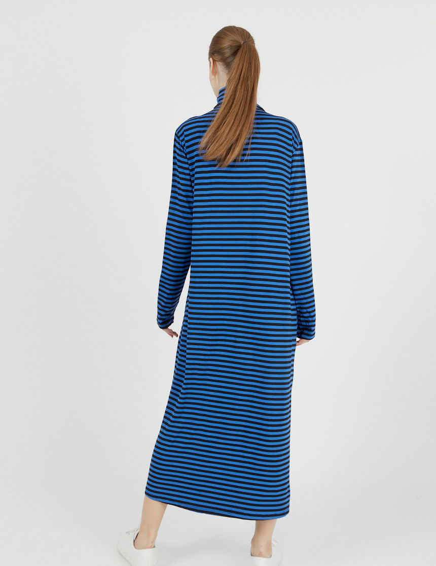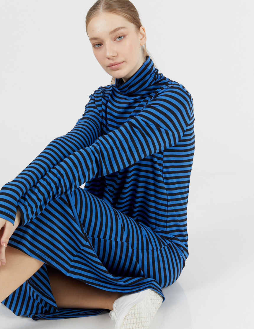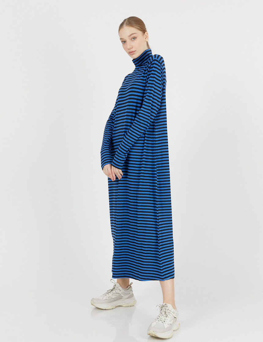 שמלה בגזרה ישרה באורך מידי  מעט רחוקה מהגוף עם צווארון גולף מתקפל עם שרוול ארוך עשויה בד סריג איכותי וויסקוזה עם מעט ליקרה