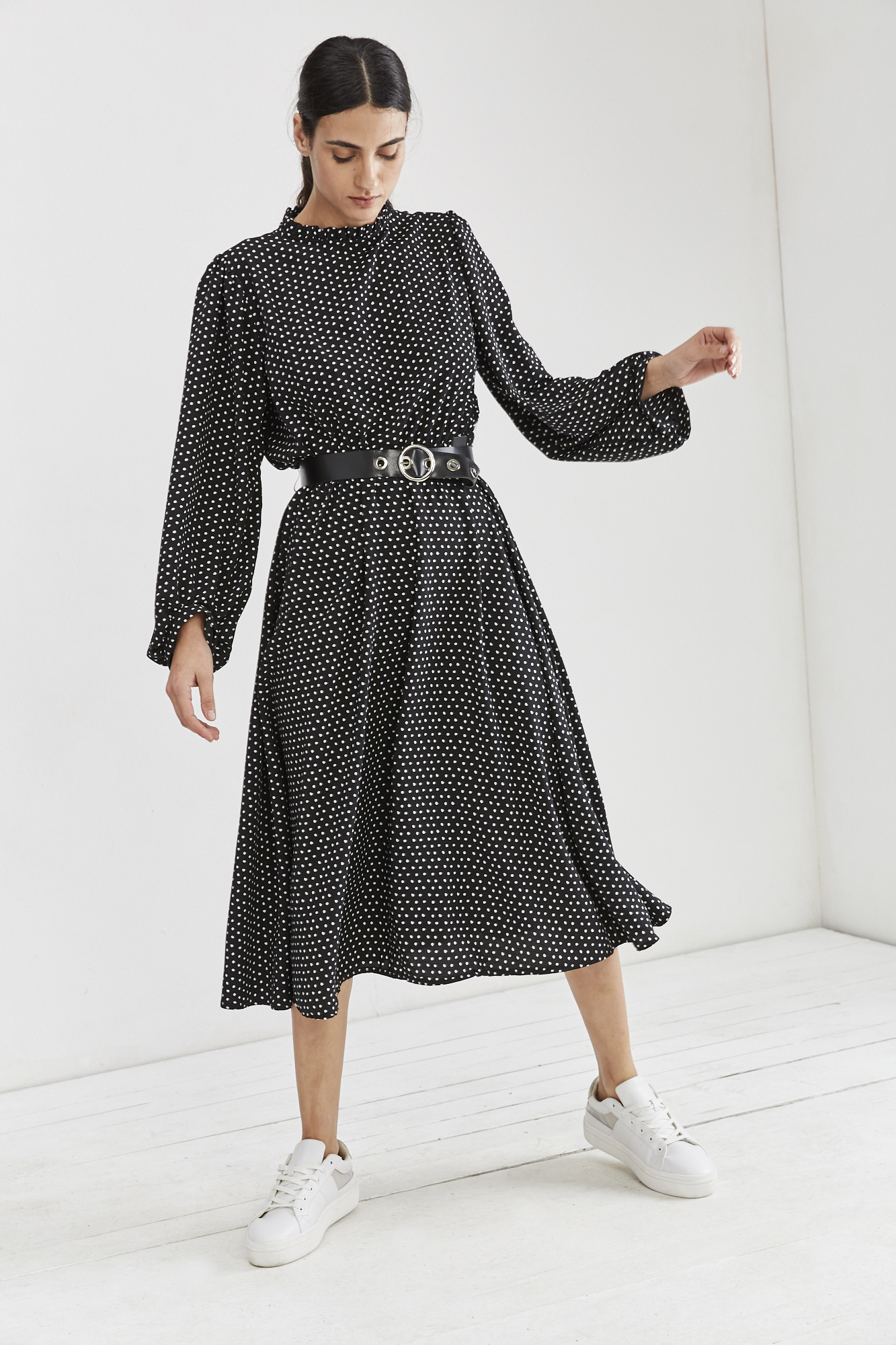 שמלת מידי עם עיגולים קטנים, שרוולים רחבים, צווארון גבוה וכווץ במותן בשילוב חגורת דמוי עור