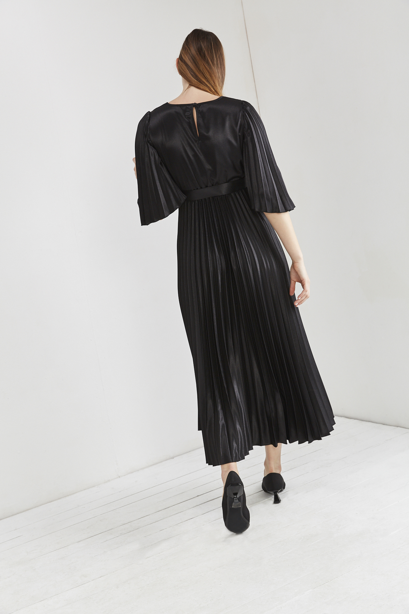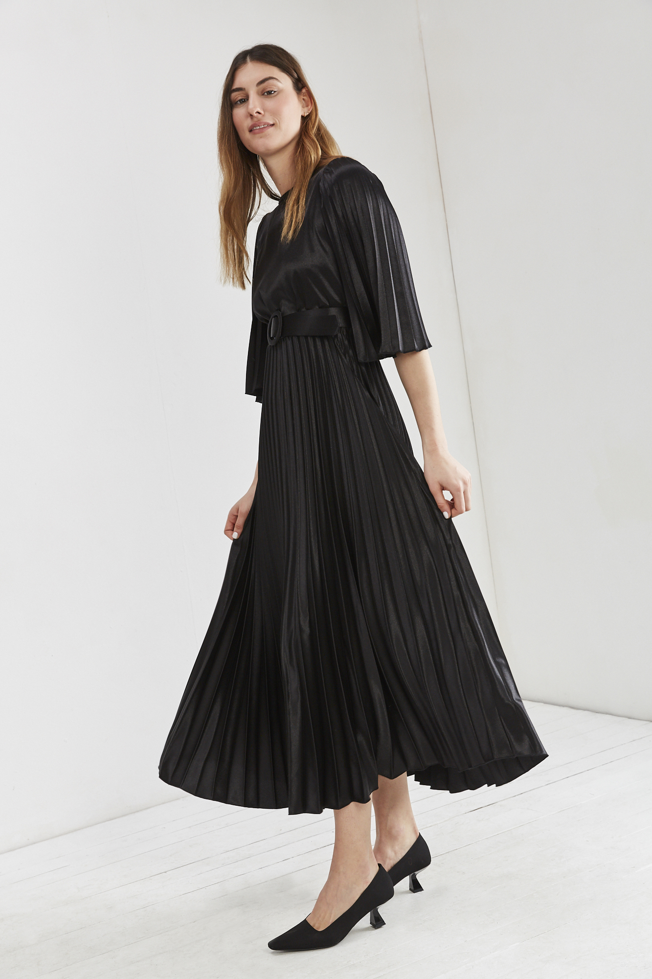 עם שרוול פליסה וחצאית פליסה גבוהה וחגורת