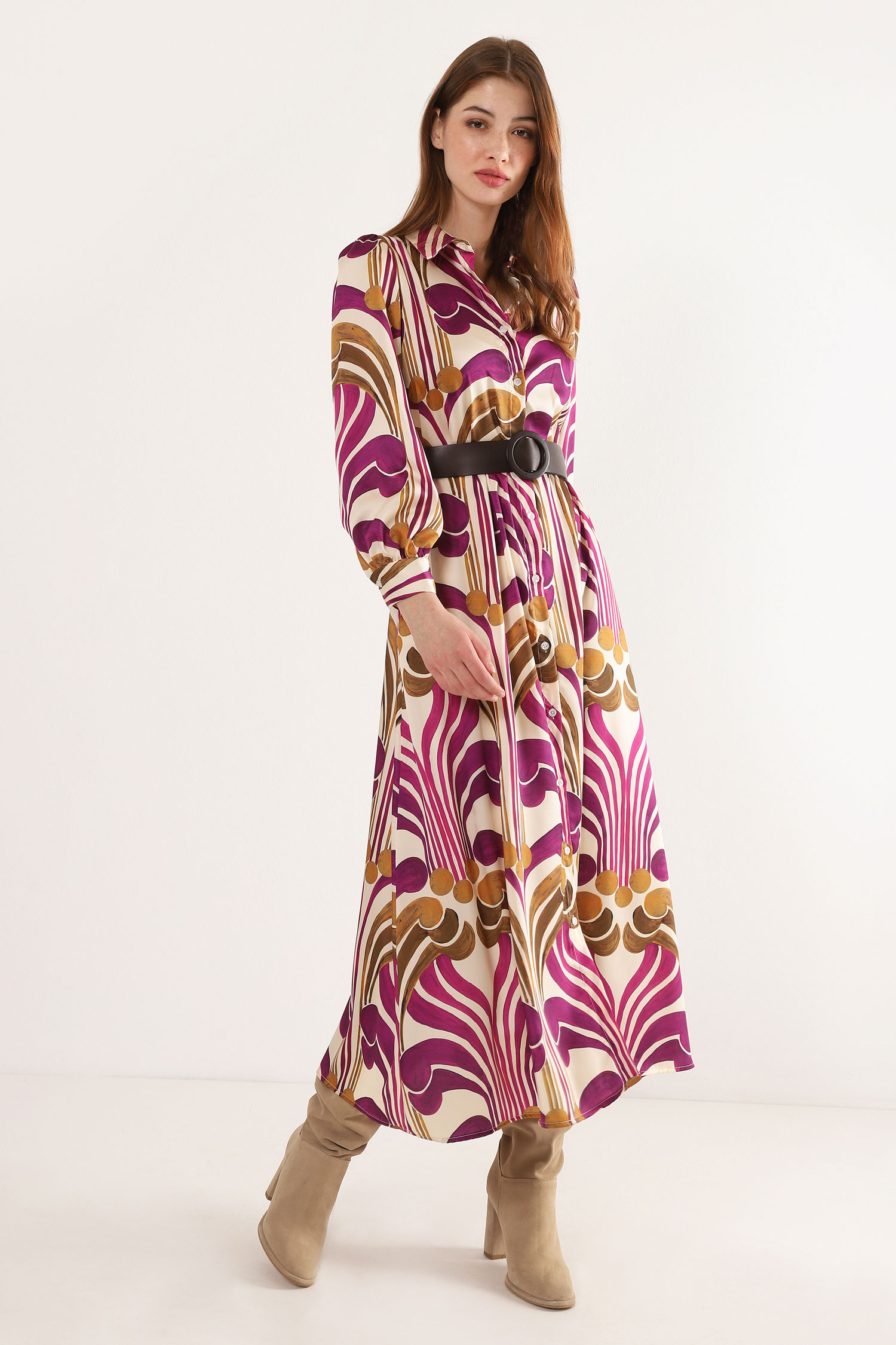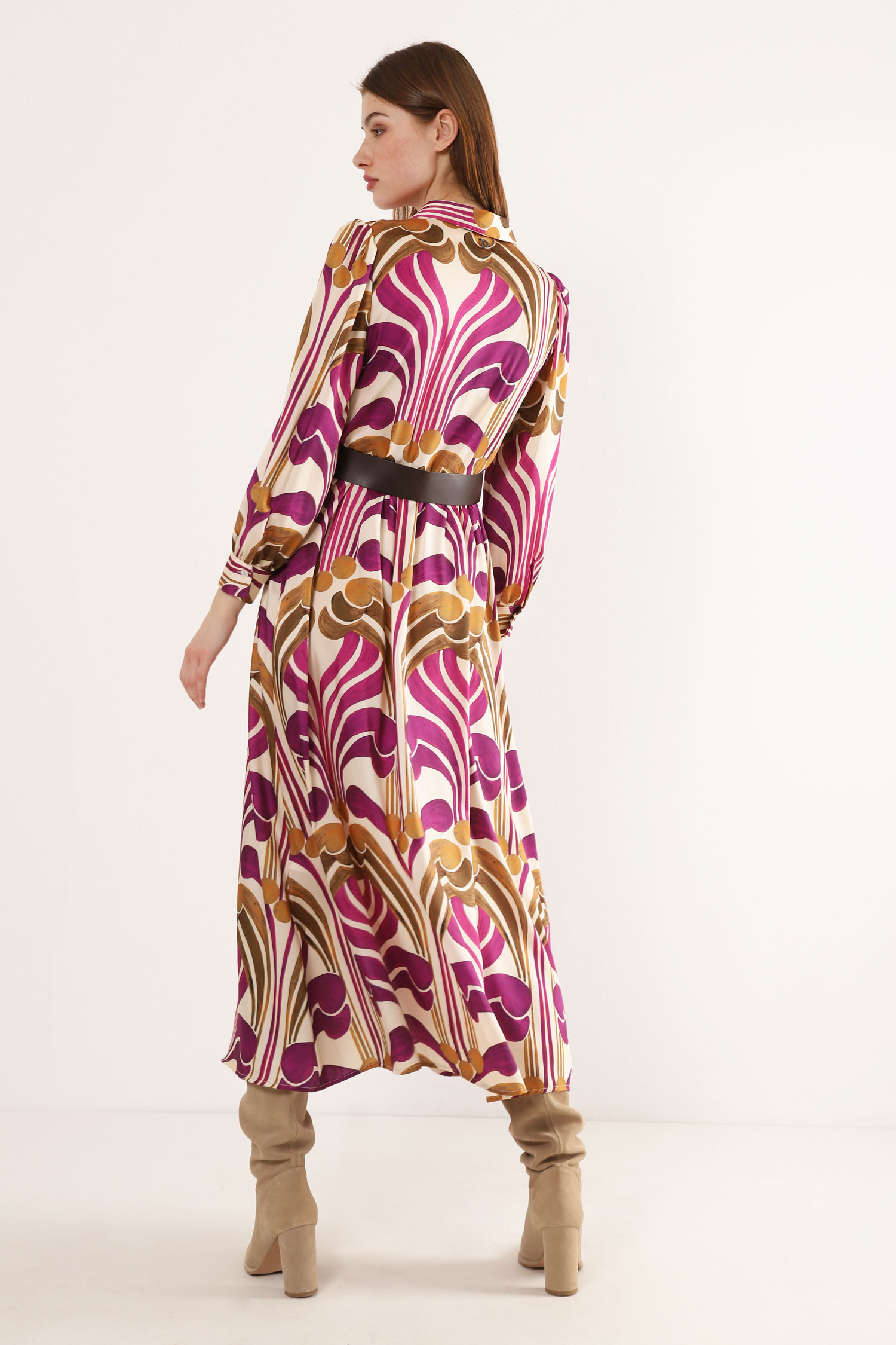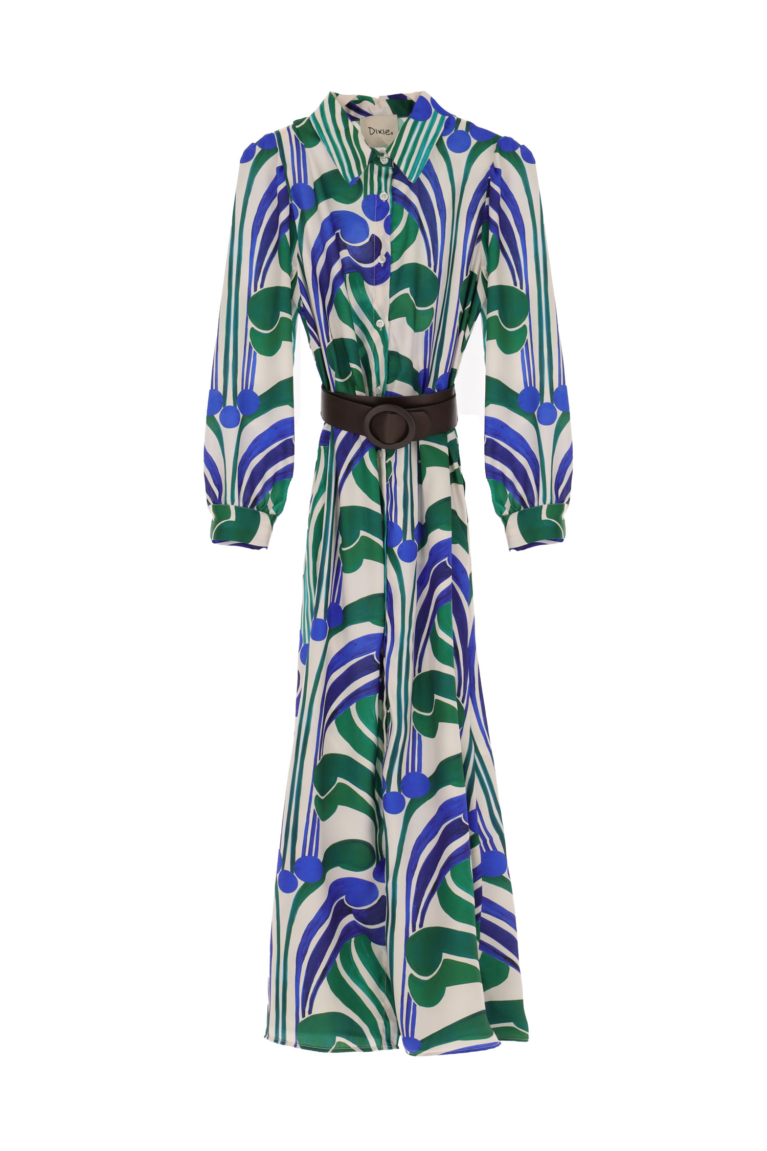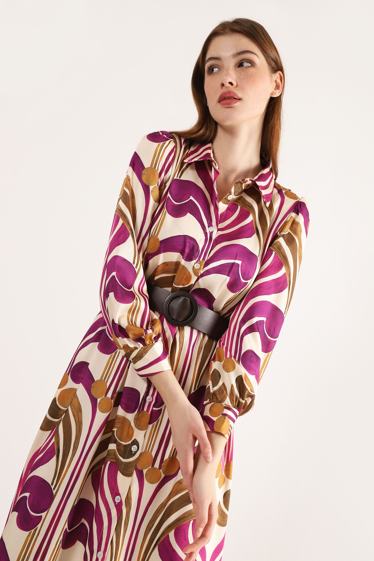 שמלת-חולצה בהדפס פרחוני גיאומטרי, צווארון קלאסי עם כיסים וכפתורים, שרוולים ארוכים עם חפתים.