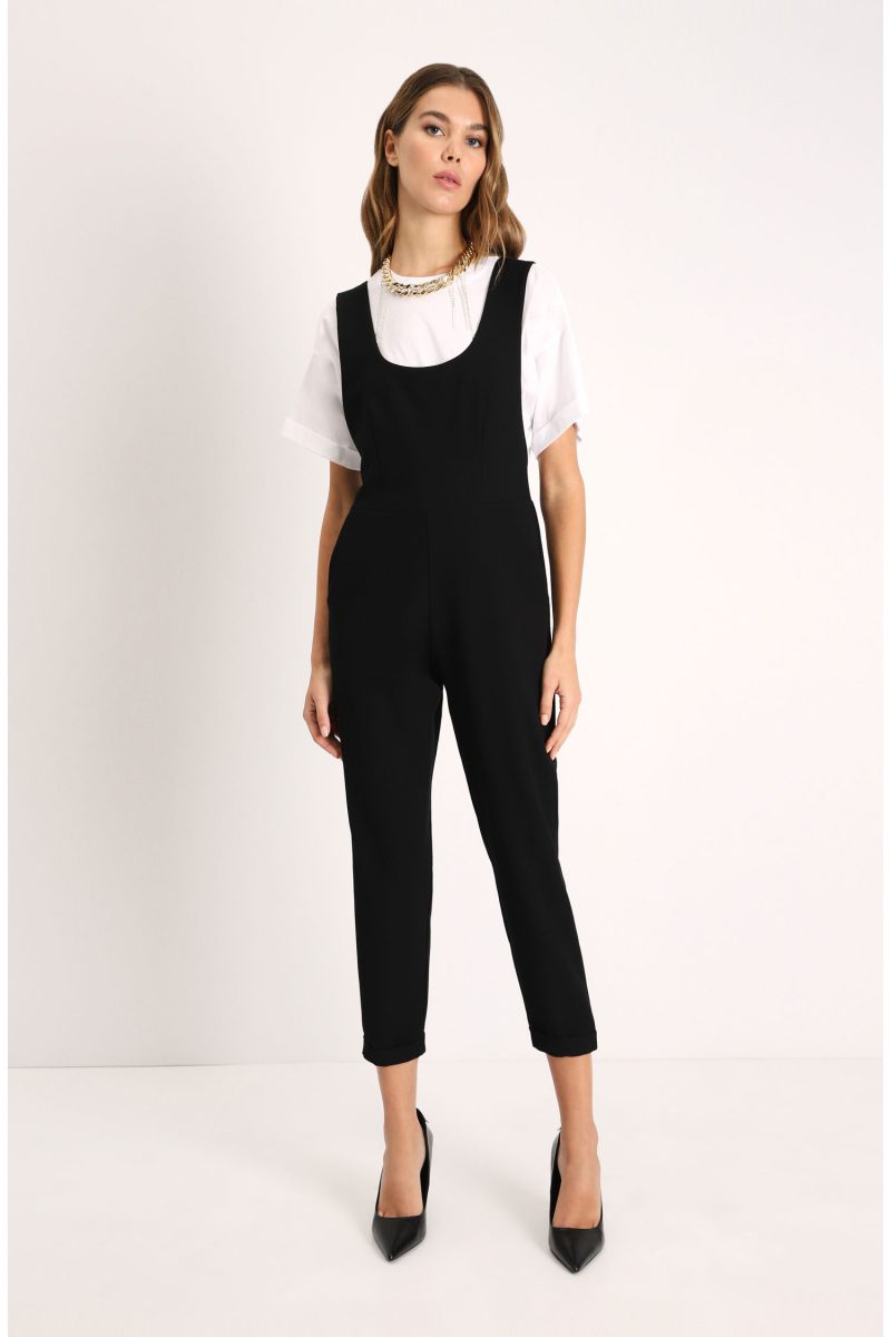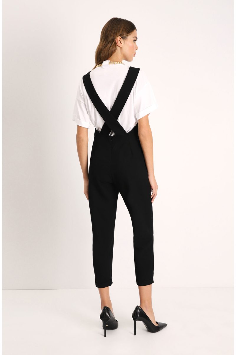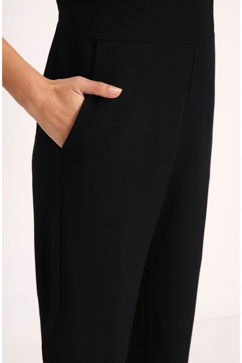 אוברול עם צווארון V ללא שרוולים עם מכנסיים צרים.