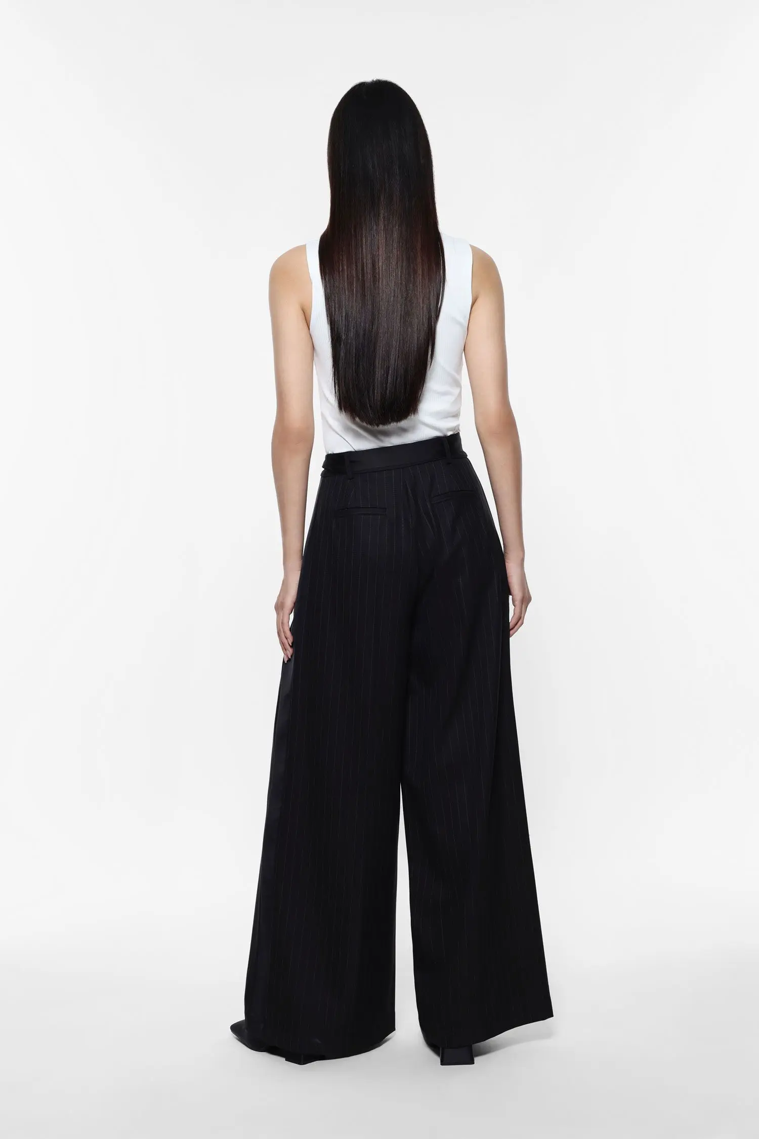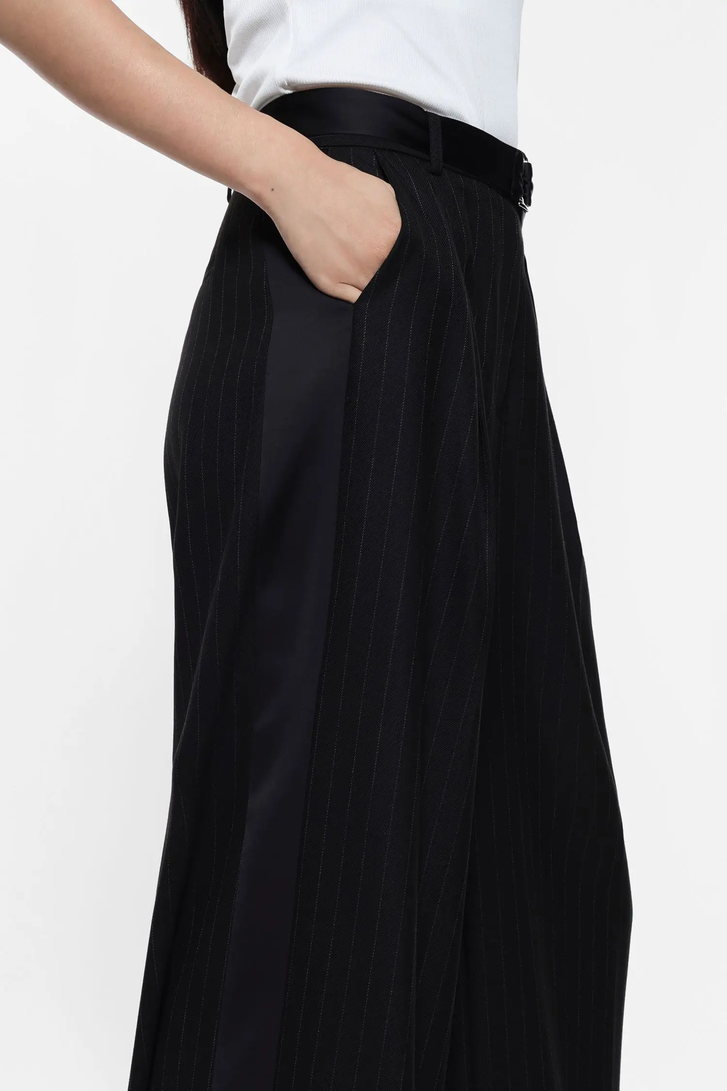 מכנסיים מתרחבים בגזרה גבוהה. פסי סיכה אנכיים ושילוב בד סאטן בצדי הרגליים. רוכסן וקרס נסתרים למראה אלגנטי.